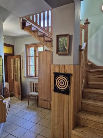 На першому поверсі велика (близько 40 м2) вітальня з трьома входами з тераси, з коридору та з кухні, кухня, гостьовий туалет, коридор, сходи з масиву ясеня.